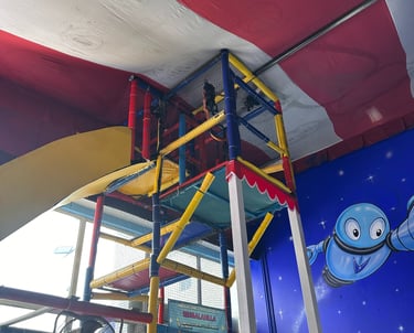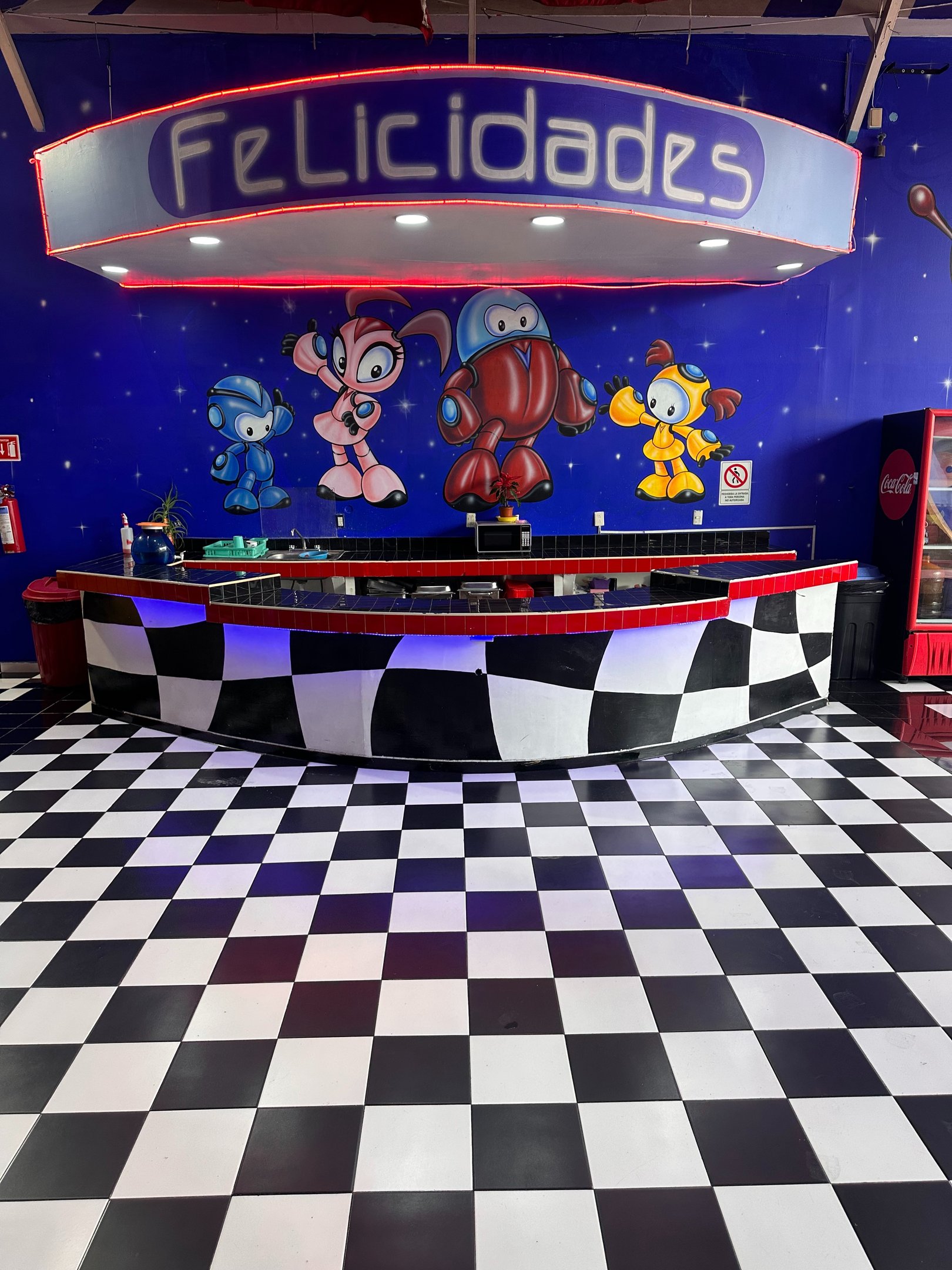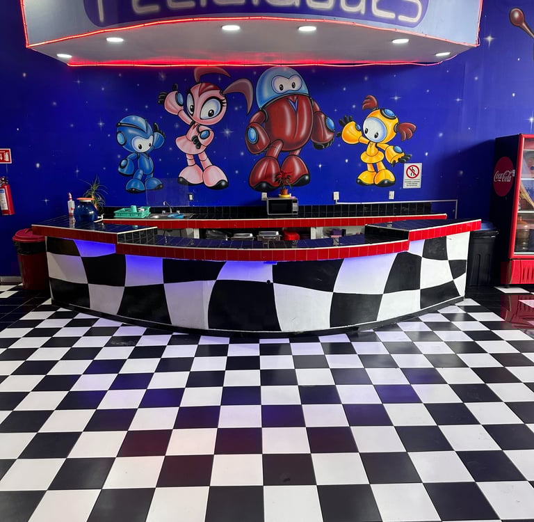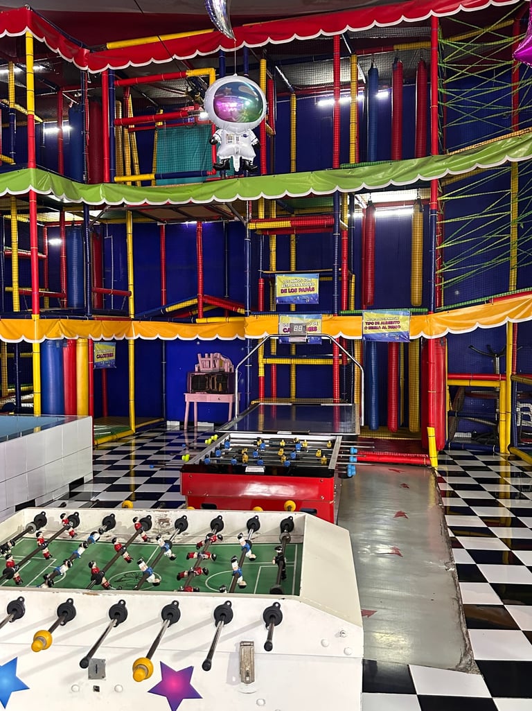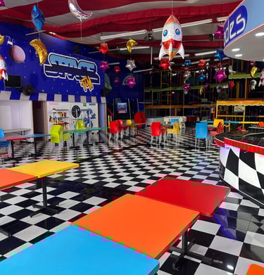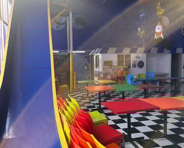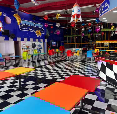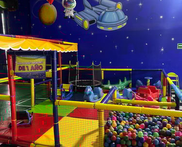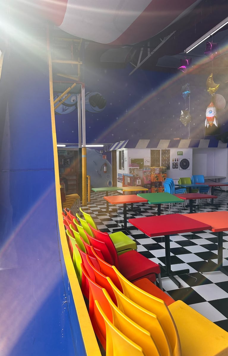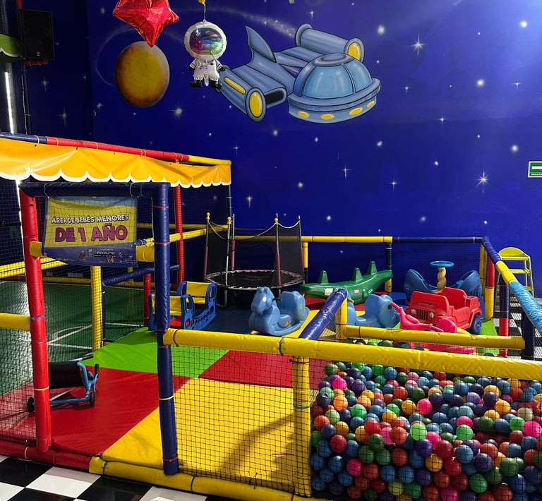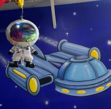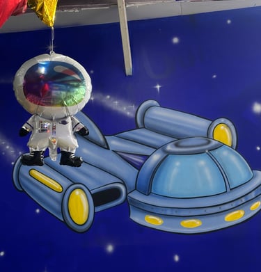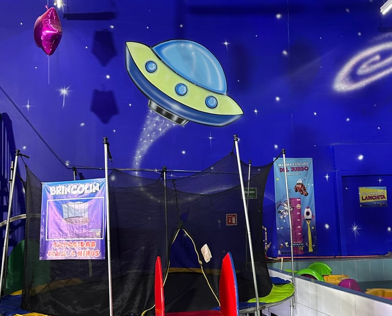 La decoración es temática galáctica con luces moradas y azules, y detalles espaciales.
